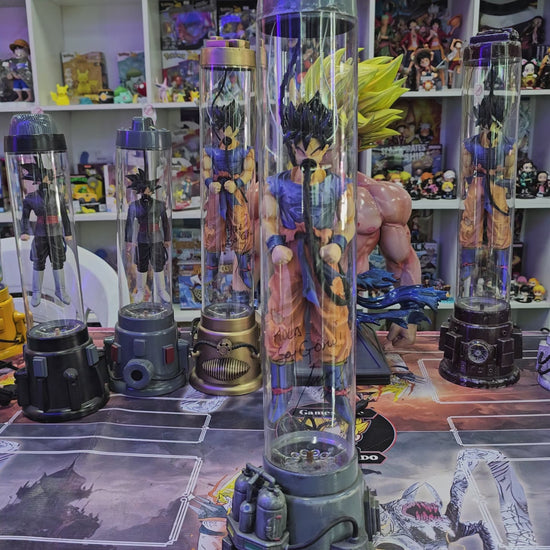 Esta lámpara combina agua, burbujas y luces de colores, dando vida al poderoso Goku dentro de su cápsula de recuperación.