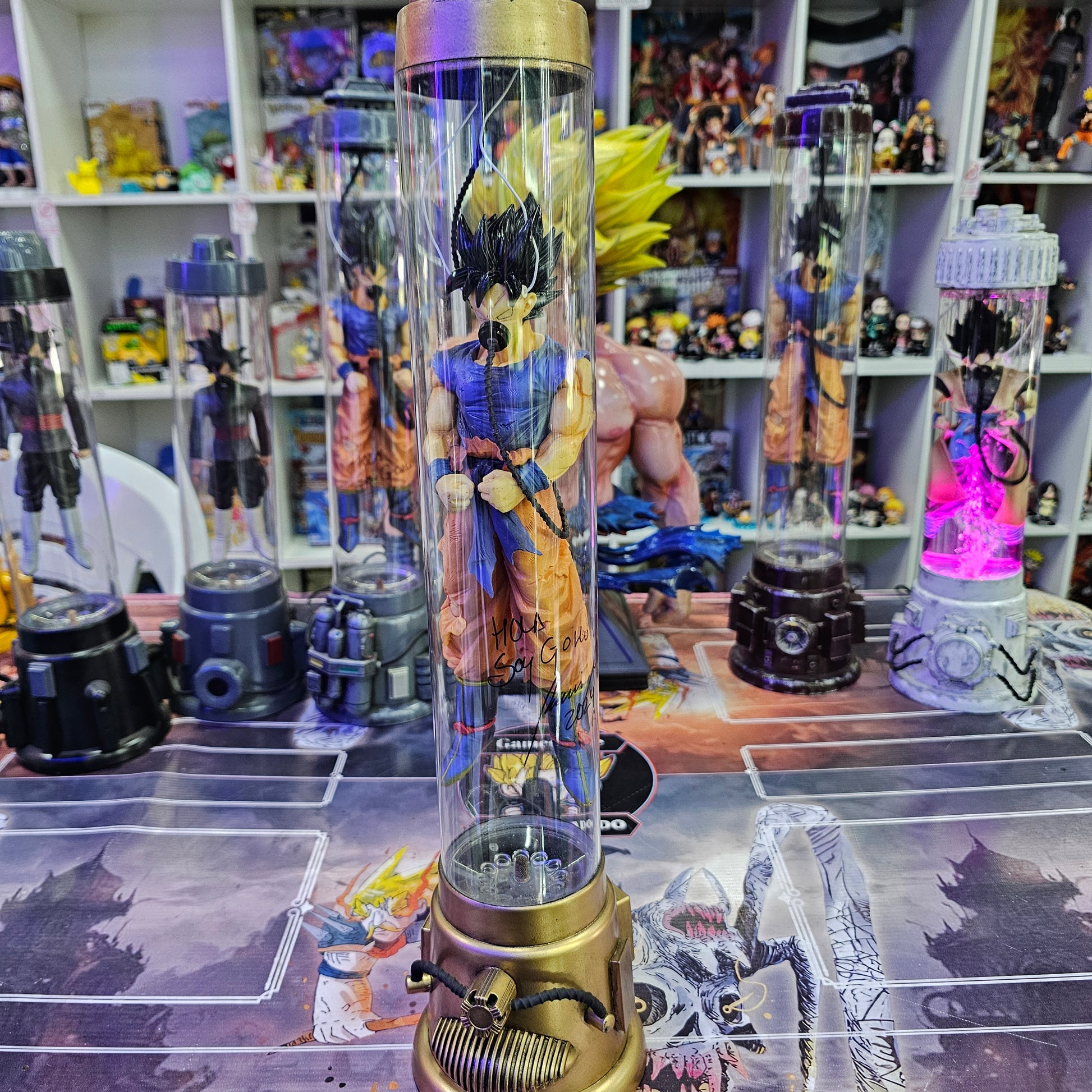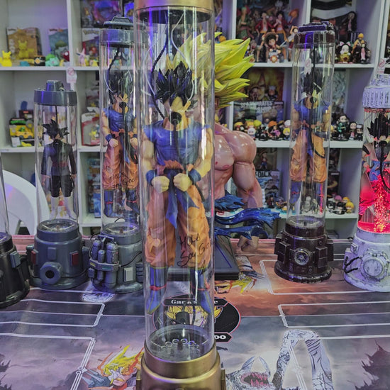 Esta lámpara combina agua, burbujas y luces de colores, dando vida al poderoso Goku dentro de su cápsula de recuperación.